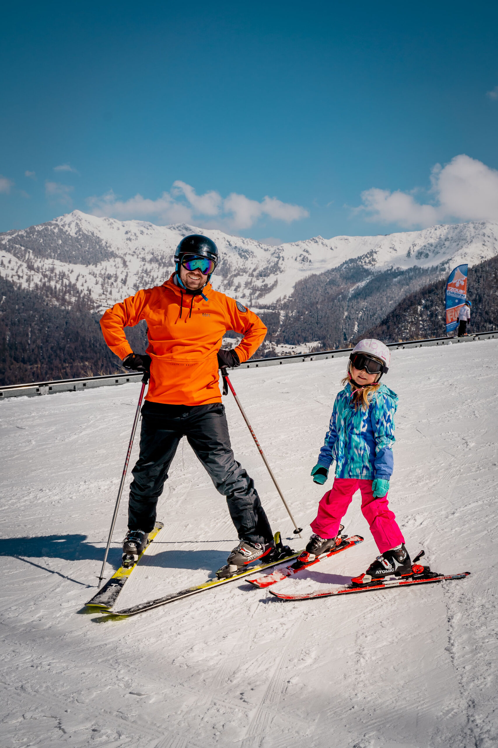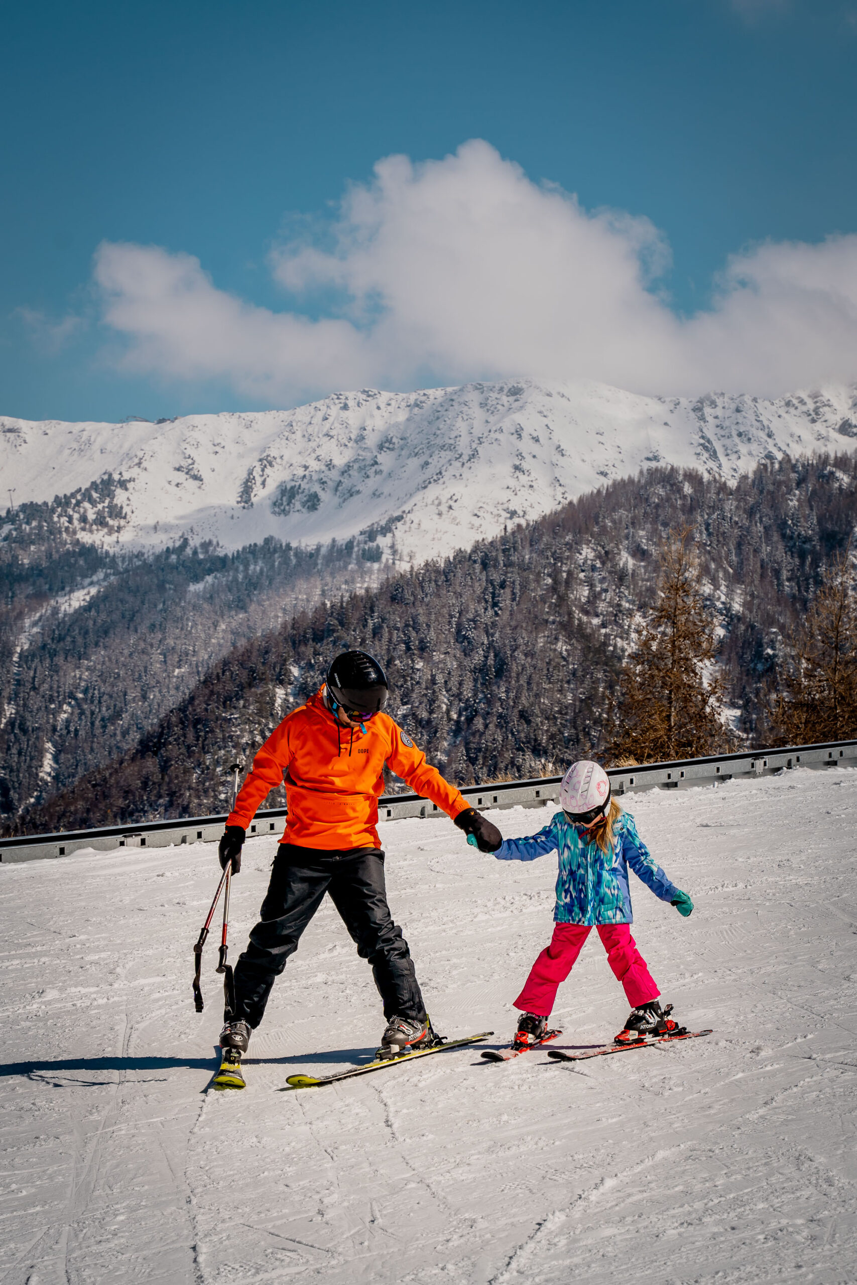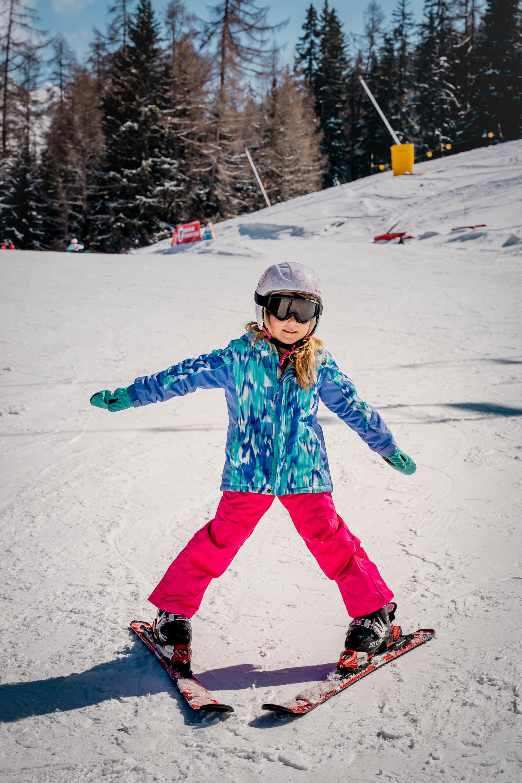 This area allowed our girls to learn in a safe and secure environment on a gentle slope. To get to the top, there was a magic carpet (a bit like a conveyor at a supermarket). We also had Helene who was a fantastic and patient Ski instructor from ESS Ski. On Day 1 Lily made tremendous progress and in just 2 hours she was soon skiing all the way down the slope. Helene made sure that the girls had a lot of fun and by the end, they were ready to tackle the blue slopes.