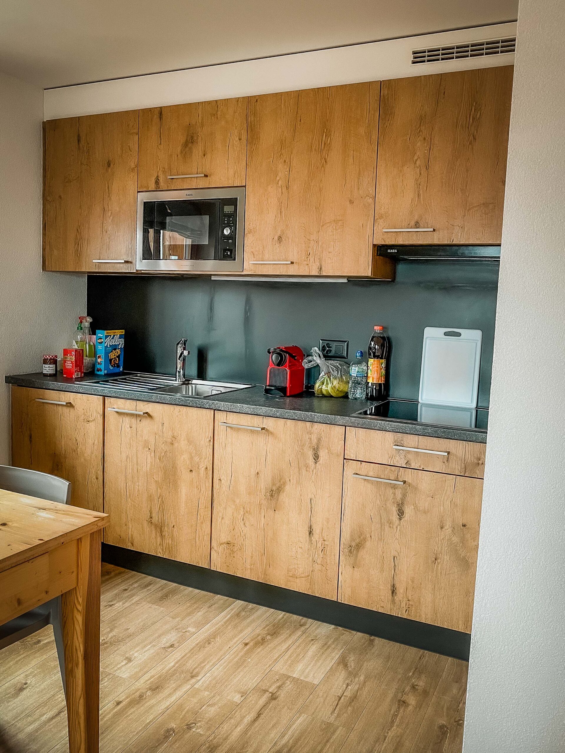 We spent 5 nights at T-Resort which is a self-catered apartment. It’s only a snowball throw from the main lift in La Tzoumazou, so it’s very convenient. Our apartment came with a flat-screen TV with satellite channels (which even included the BBC!) a couple of bathrooms (one of which had a much needed bath!) There’s also a dishwasher, a microwave oven and a hob, so we could easily prepare our own meals.